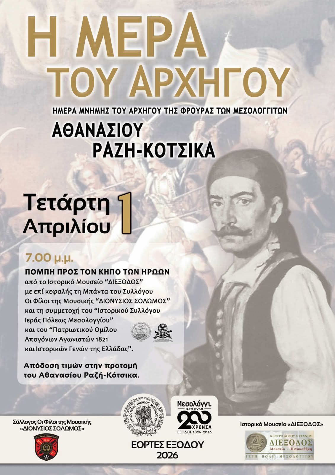 Αύριο Τετάρτη 1 Απριλίου 2026 θα τιμηθεί στο Μεσολόγγι «η Ημέρα του Αρχηγού» του Αθανάσιου Ραζή-Κότσικα, στο πλαίσιο των εκδηλώσεων για τη Διακοσιοστή Επέτειο από την Ηρωική Έξοδο.