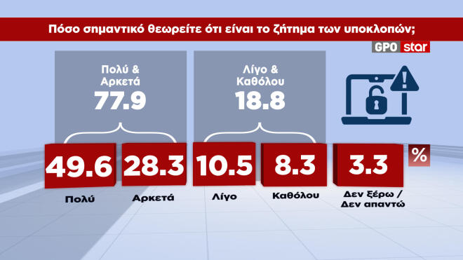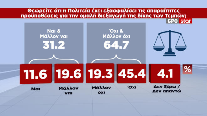 Το 64,7% θεωρεί ότι η Πολιτεία δεν έχει εξασφαλίσει την ομαλή διεξαγωγή της δίκης των Τεμπών, ενώ το 77,9% αξιολογεί ως πολύ και αρκετά σημαντικό το ζήτημα των υποκλοπών.