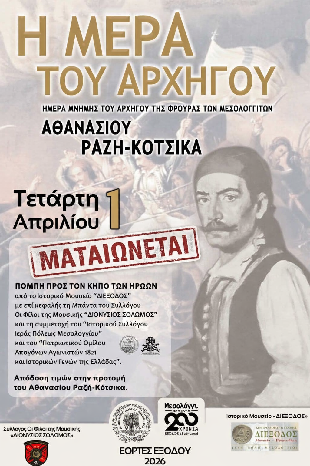 Ο Σύλλογος «Οι Φίλοι της Μουσικής Διονύσιος Σολωμός» και το Ιστορικό Μουσείο «Διέξοδος» ενημερώνουν το κοινό ότι η προγραμματισμένη εκδήλωση για την «Ημέρα του Αρχηγού», στο πλαίσιο των Εορτών Εξόδου, δεν θα πραγματοποιηθεί λόγω των προβλεπόμενων δυσμενών καιρικών συνθηκών.