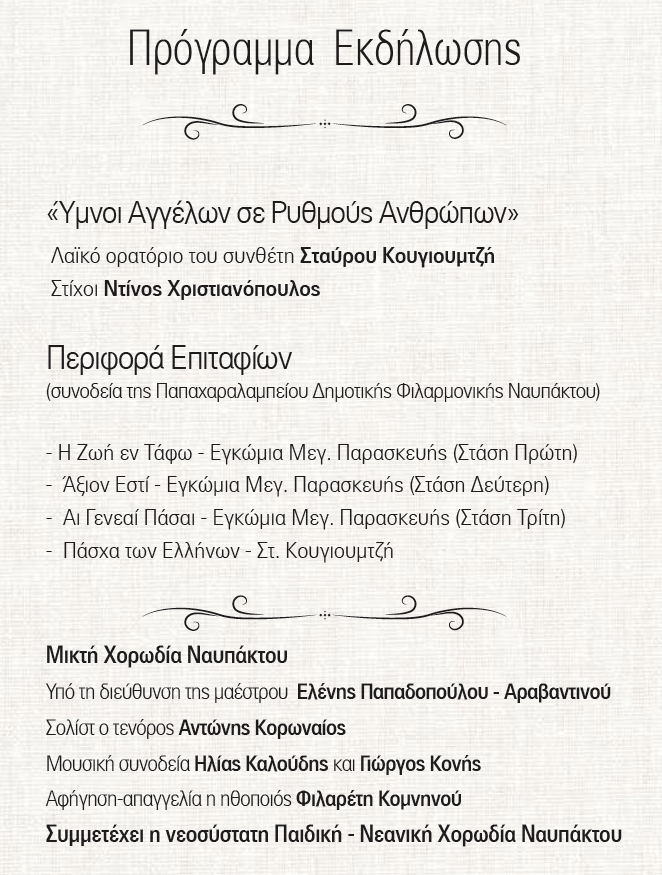 Κατά τη διάρκεια της πομπής των Επιταφίων και μέχρι την άφιξή τους στο Ενετικό Λιμάνι, η Μικτή Χορωδία Ναυπάκτου με σολίστ τον τενόρο Αντώνη Κορωναίο, υπό τη διεύθυνση της μαέστρου Ελένης Παπαδοπούλου-Αραβαντινού, θα αποδώσουν το λαϊκό ορατόριο «Ύμνοι Αγγέλων σε Ρυθμούς Ανθρώπων» του Σταύρου Κουγιουμτζή, σε στίχους του Ντίνου Χριστιανόπουλου, τα Εγκώμια της Μεγάλης Παρασκευής «Η Ζωή εν Τάφω», «Άξιον Εστί» και «Αι Γενεαί Πάσαι», καθώς και το «Πάσχα των Ελλήνων». Συμμετέχει η Παιδική-Νεανική Χορωδία Ναυπάκτου. Στην αφήγηση και απαγγελία θα είναι η ηθοποιός Φιλαρέτη Κομνηνού. Συμμετέχουν οι μουσικοί Ηλίας Καλούδης και Γιώργος Κονής.