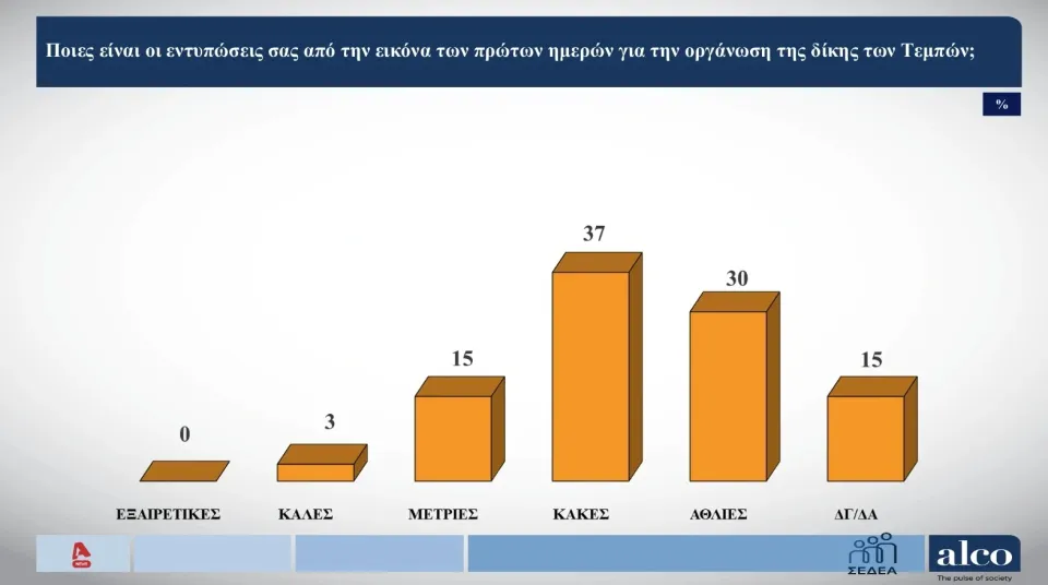 Αρνητική εντύπωση άφησαν και τα όσα διαδραματίστηκαν την πρώτη ημέρα της δίκης των Τεμπών. Το 37% μιλά για «κακές εντυπώσεις», το 30% για «άθλιες» ενώ το 15% για «μέτριες».