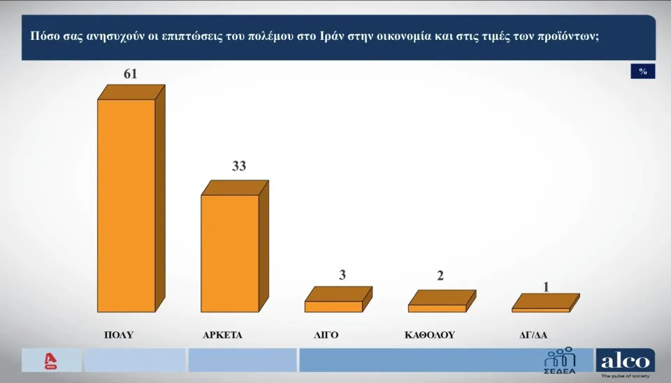 Περισσότεροι από εννέα στους 10 ερωτηθέντες δεν κρύβουν την ανησυχία τους για τις επιπτώσεις του πολέμου στο Ιράν στην οικονομία και στις τιμές των προϊόντων. Το 61% απαντά «πολύ» και το 33% «αρκετά».