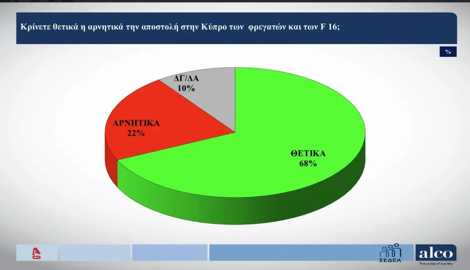 Το 68% των ερωτηθέντων κρίνει θετικά την απόφαση για αποστολή στην Κύπρο των δυο φρεγατών και των F16 ενώ αντίθετη άποψη εκφράζει το 22%.