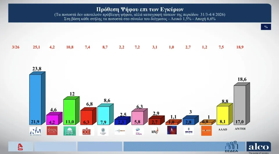 Πηγή: Δημοσκόπηση Alco: Στο 23,8% η ΝΔ – «Απώλεια» μετά τις εξελίξεις στον ΟΠΕΚΕΠΕ