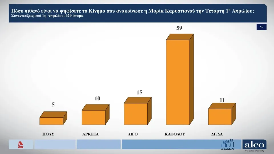 Ένα ποσοστό που αθροιστικά φθάνει στο 15% εμφανίζει η Μαρία Καρυστιανού στο ερώτημα πόσο πιθανό είναι να ψηφίσετε το κόμμα που ανακοίνωσε την προηγούμενη Τετάρτη. «Λίγο» απαντά το 15% ενώ το 59% λέει «καθόλου».