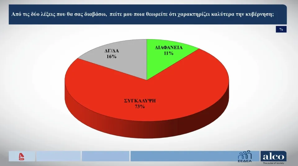 Η αξιοπιστία, αναδεικνύεται στο μείζον ζήτημα για την κυβερνητική πλειοψηφία καθώς σύμφωνα με τη δημοσκόπηση, το 73% θεωρεί πως η λέξη «συγκάλυψη» είναι εκείνη που χαρακτηρίζει καλύτερα την κυβέρνηση. Ενώ μόλις το 11% απαντά η «διαφάνεια».