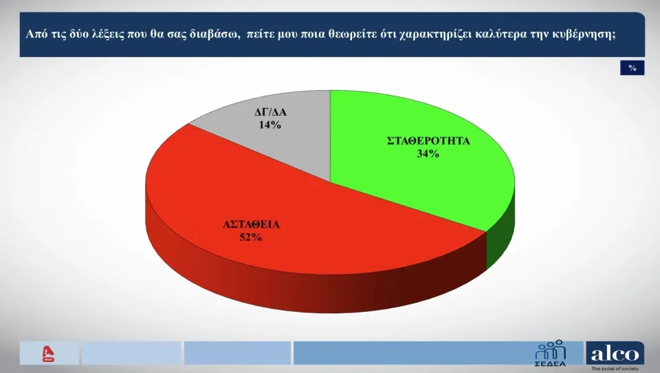 Η λέξη «αστάθεια» είναι αυτή που χαρακτηρίζει την κυβέρνηση σε ποσοστό 52% ενώ το 34% – ποσοστό σαφώς υψηλότερο από την εικόνα της ΝΔ στην πρόθεση ψήφου – απαντά πως η «σταθερότητα» χαρακτηρίζει την κυβέρνηση.