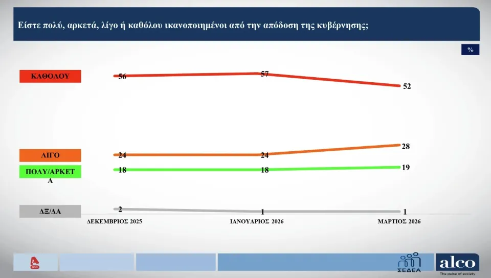 Αναποτελεσματική χαρακτηρίζει την κυβέρνηση το 66% των ερωτηθέντων ενώ το 52% «καθόλου» ως προς την ικανοποίηση από την απόδοση της κυβέρνησης. Το 28% απαντά «λίγο» και το 19% «πολύ/αρκετά».