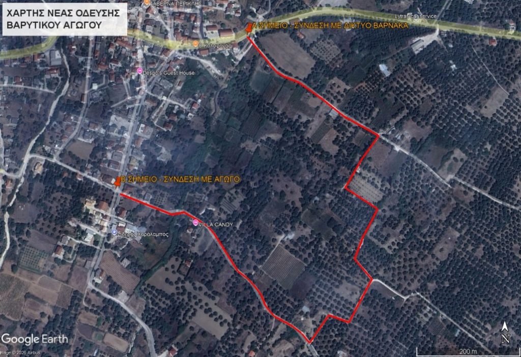 Από την Τρίτη του Πάσχα 14 Απριλίου 2026 θα ξεκινήσουν οι εργασίες διέλευσης του βαρυτικού αγωγού που συνδέει τον οικισμό Βάρνακα με τις εγκαταστάσεις Ε.Ε.Λ., από υφιστάμενη δημοτική/αγροτική οδό συνολικού μήκους περίπου 1.400 μέτρων, όπως φαίνεται στο χάρτη, από την οποία θα διέλθουν βαρέα οχήματα και μηχανήματα για την εκτέλεση των εργασιών.
