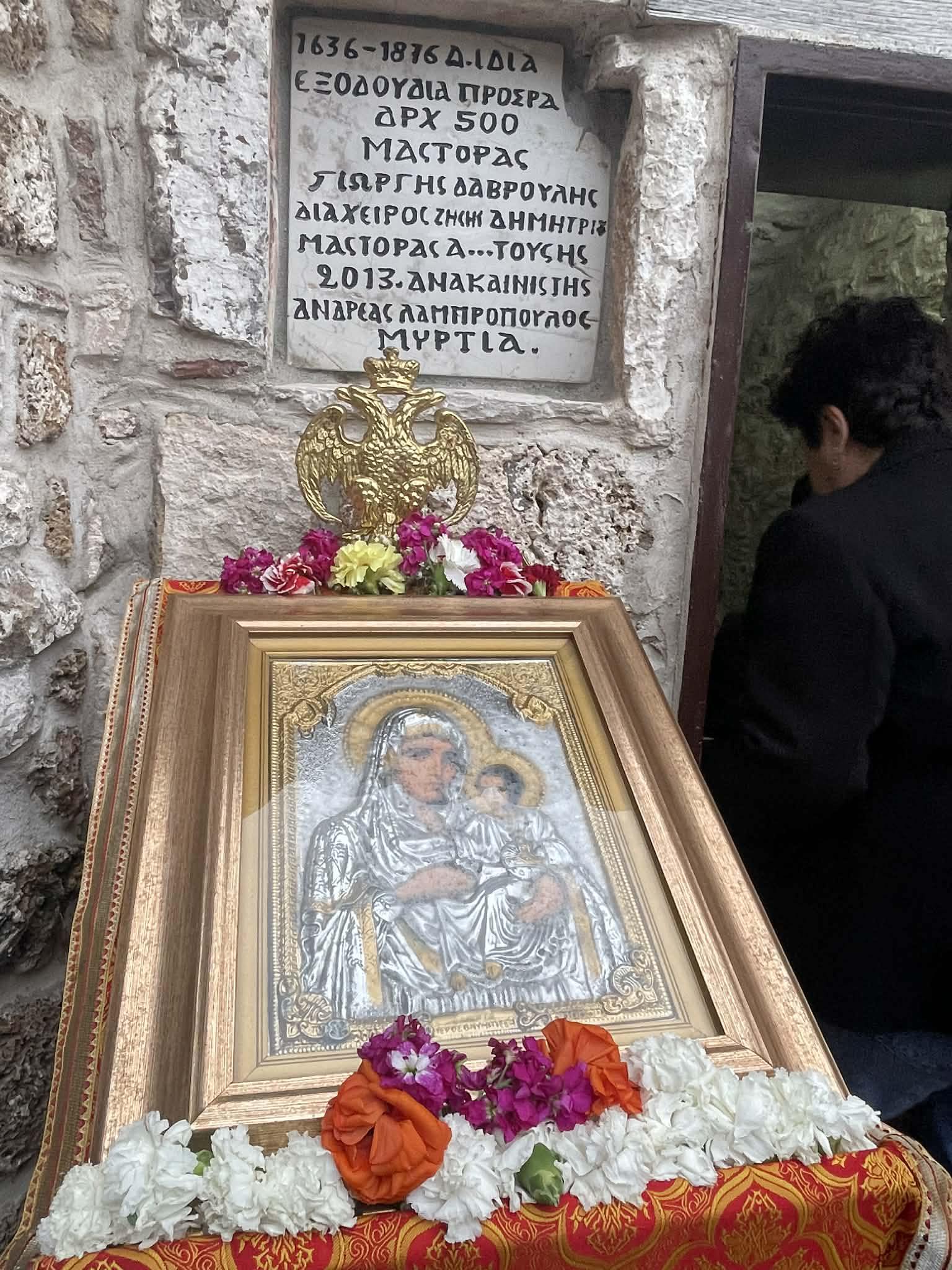 Πανηγυρικός Εσπερινός στην Αγία Ελεούσα Μυρτιάς , στον σπηλαιώδη ναό της Ζωοδόχου Πηγής , όπου κάθε χρόνο συρρέουν εκατοντάδες πιστοί στο αγνάντιο της Τριχωνίδας.