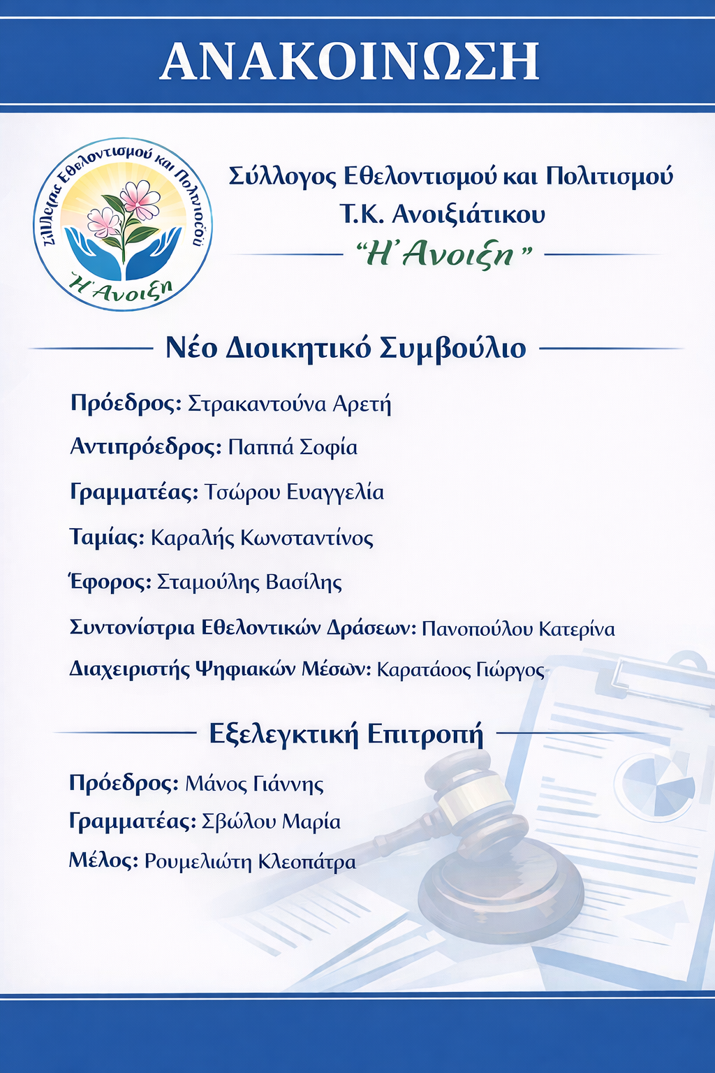 Πηγή: Νέο Δ.Σ. για το Σύλλογο Εθελοντισμού και Πολιτισμού Τ.Κ. Ανοιξιάτικου «Η Άνοιξη»