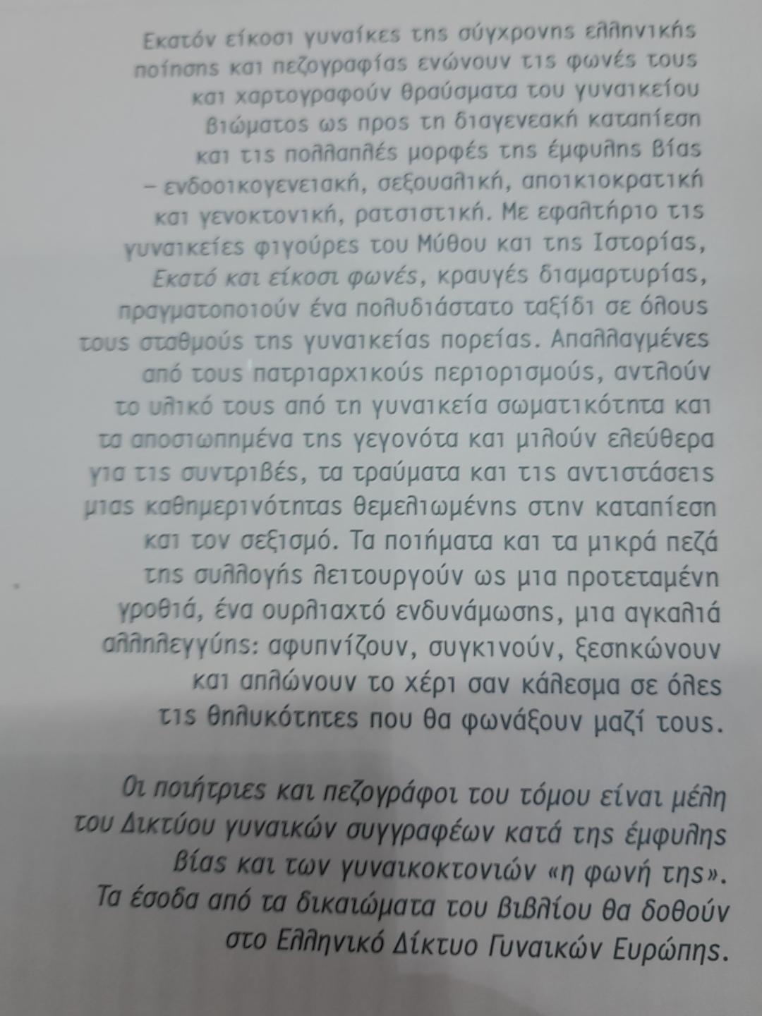 Το βιβλίο περιλαμβάνει ποιήματα και μικρά πεζά 120 γυναικών συγγραφέων, που ενώνουν τις φωνές τους κατά των γυναικοκτονιών και της έμφυλης βίας.