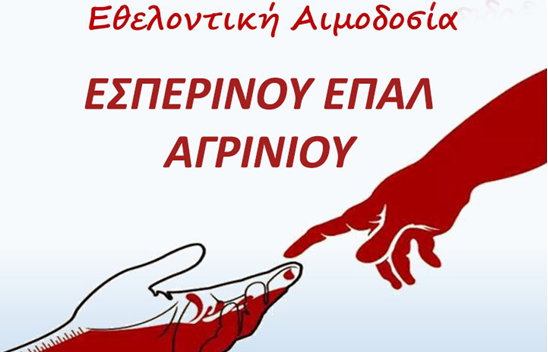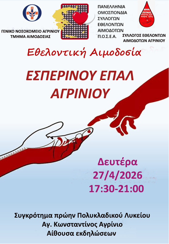 Ενημερώνουμε ότι τη Δευτέρα 27 Απριλίου 2026 θα πραγματοποιηθεί η ετήσια Εθελοντική Αιμοδοσία του Εσπερινού ΕΠΑ.Λ. Αγρινίου, στην αίθουσα εκδηλώσεων του σχολείου μας, σε συνεργασία με το Τμήμα Αιμοδοσίας του Γενικού Νοσοκομείου Αγρινίου και τον Σύλλογο Εθελοντών Αιμοδοτών Αγρινίου…..