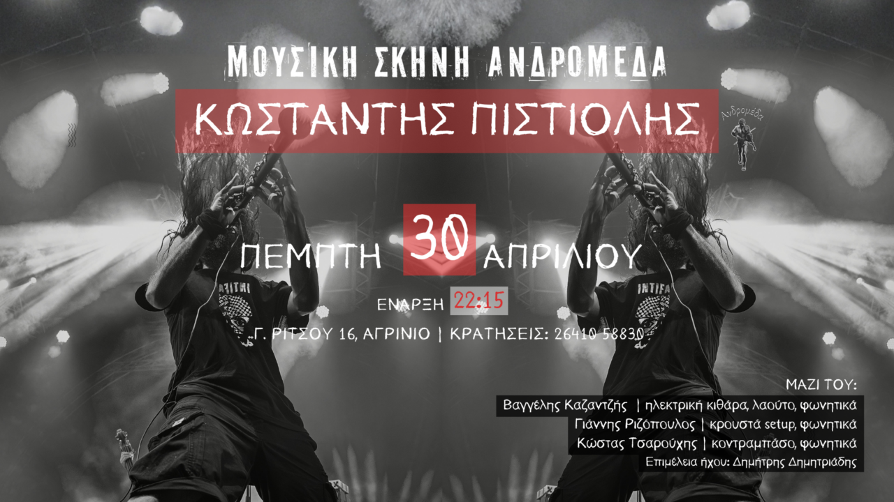 Ο Κωσταντής Πιστιόλης εμφανίζεται στη Μουσική Σκηνή Ανδρομέδα την Πέμπτη 30 Απριλίου στο Αγρίνιο, παρουσιάζοντας τραγούδια από τη δισκογραφία του και από τις μουσικές διαδρομές που μέχρι σήμερα έχει χαράξει.