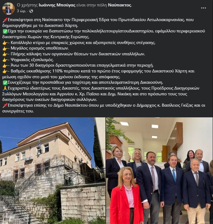 Πηγή: Επίσκεψη του Υφυπουργού Δικαιοσύνης Ι. Μπούγα στη Ναύπακτο – “Εφάμιλλο περιφερειακού δικαστηρίου χωρών της κεντρικής Ευρώπης το Πρωτοδικείο”