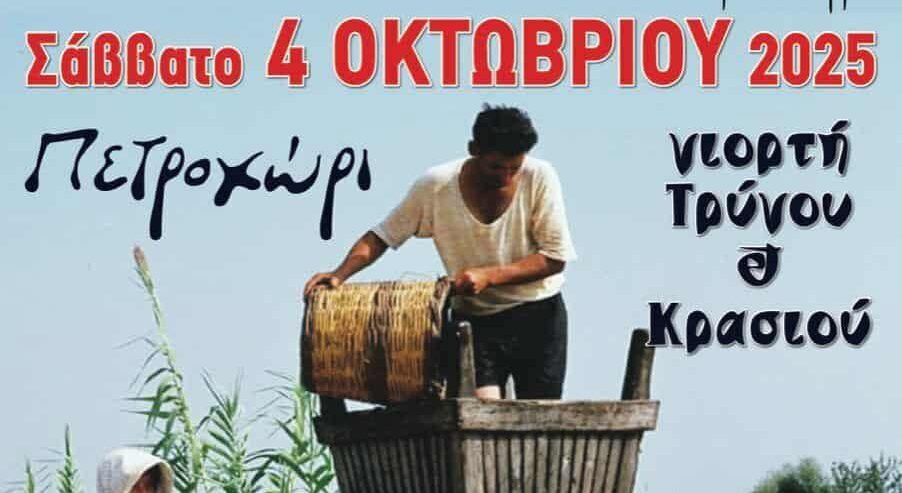 Πλούσιο το πρόγραμμα της Γιορτής Τρύγου και Κρασιού στο Πετροχώρι Θέρμου, που διοργανώνει ο Σύλλογος Πετροχωριτών Τριχωνίδας, σε συνεργασία με τον Δήμο Θέρμου. Ο Σύλλογος Πετροχωριτών Τριχωνίδας, σε συνεργασία με τον Δήμο Θέρμου, διοργανώνει μια ξεχωριστή Γιορτή Τρύγου και Κρασιού το Σάββατο 4 Οκτωβρίου 2025, στο Πετροχώρι Θέρμου. Η εκδήλωση αναβιώνει παλιά έθιμα και παραδοσιακές […]